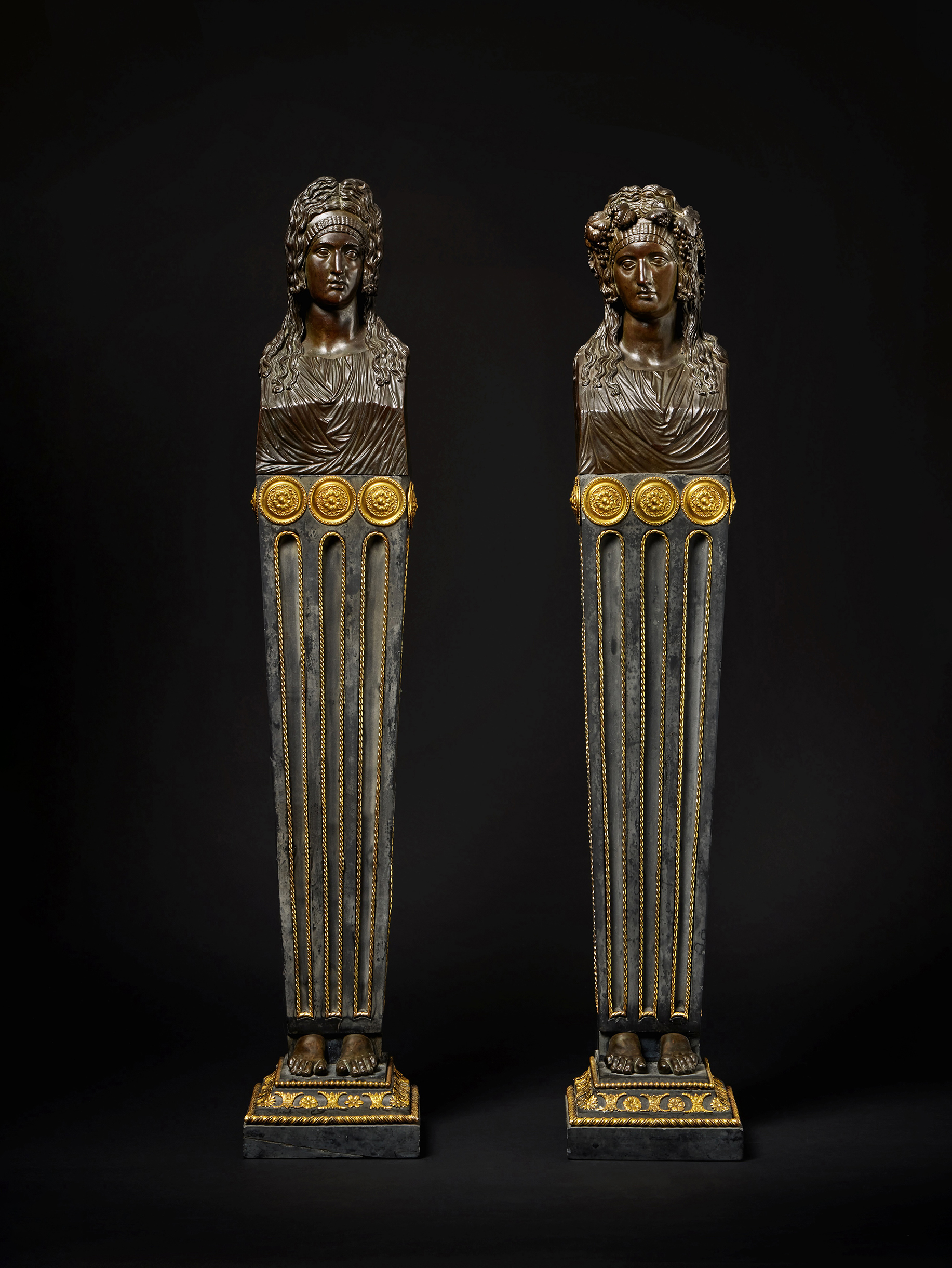 These exceptional busts appear to be unique. They are copies of two famous antique herm busts representing Salonia Matidia in the guise of Melpomene, muse of Tragedy and Salonia Matidia in the guise of Thalia, muse of Comedy. Both busts are in the Sala Rotonda in the Vatican’s Museo Pio-Clementino (inv. 262 and 285). The marble busts were reputedly found in 1735 by Giuseppe Fede at Hadrian’s Villa near the entrance to the Greek theater. Restored by Bartolomeo Cavaceppi, the busts were acquired in 1777 for the Vatican collections. By the time Righetti made his bronze reductions a decade later, the busts would have been recognizable as among the masterpieces of the Vatican. The busts stand on plain marble pedestals which continue the herm shape of the busts, but Righetti has enhanced their impact as reduced bronzes by the addition of fluted marble pedestals with human feet at the bottom cast in bronze. Displayed on a console or tabletop, the combination of Righetti’s bronzes with the elaborate pedestals create a luxurious impression befitting the theatrical subject matter and the quality of the craftsmanship.