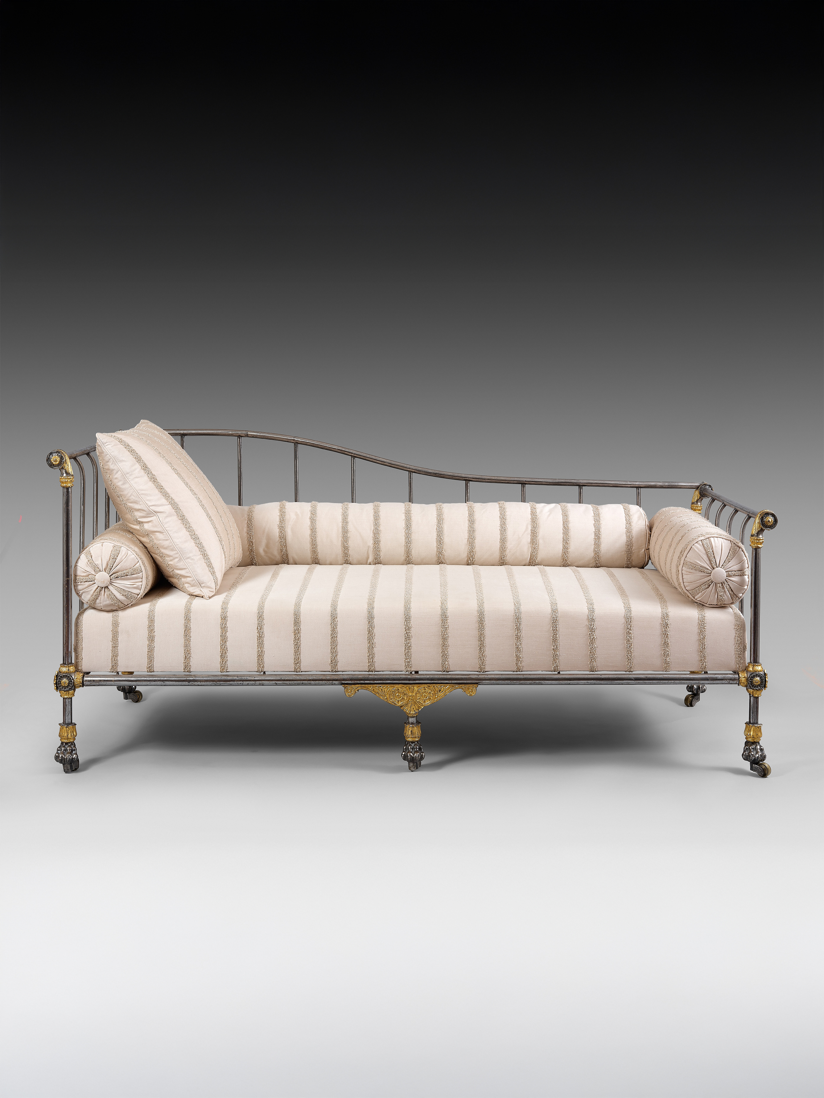The appeal of polished steel and iron furniture reached its peak in France during the Revolution, the Consulate, the Empire, and the Restoration. The quality of the materials used, but above all the prevailing taste of the time for martial furniture—a genuine reaction to the forms of expression of the Ancien Régime—contributed greatly to the success of metal furniture, whose merits were repeatedly recognized at various exhibitions of French industrial products, which began in 1798.